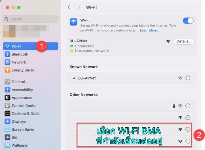 lovemusic การตั้งค่า > เมนู Wi-Fi > Other Networks > Wi-Fi BMA ที่กำลังเชื่อมต่ออยู่ > กดที่เครื่องหมายวงกลม ที่เมนู Private Wi-Fi address เลือก Off คลิก OK และ Turn Off ดังภาพ เลือกเข้าร่วมเครือข่าย BMA Wi-Fi