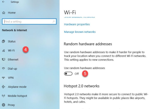 lovemusic คลิกเมนู Start หรือกดปุ่ม Windows บนแป้นพิมพ์ จากนั้นคลิก Settings (หรือใช้แป้นพิมพ์ลัด Windows + I) คลิก Network & Internet คลิก Wi-Fi จากหัวข้อด้านซ้ายมือ จากนั้นด้านขวามือในหัวข้อ Random hardware addresses ตั้งค่า Use random hardware addresses เป็น Off ดังภาพ